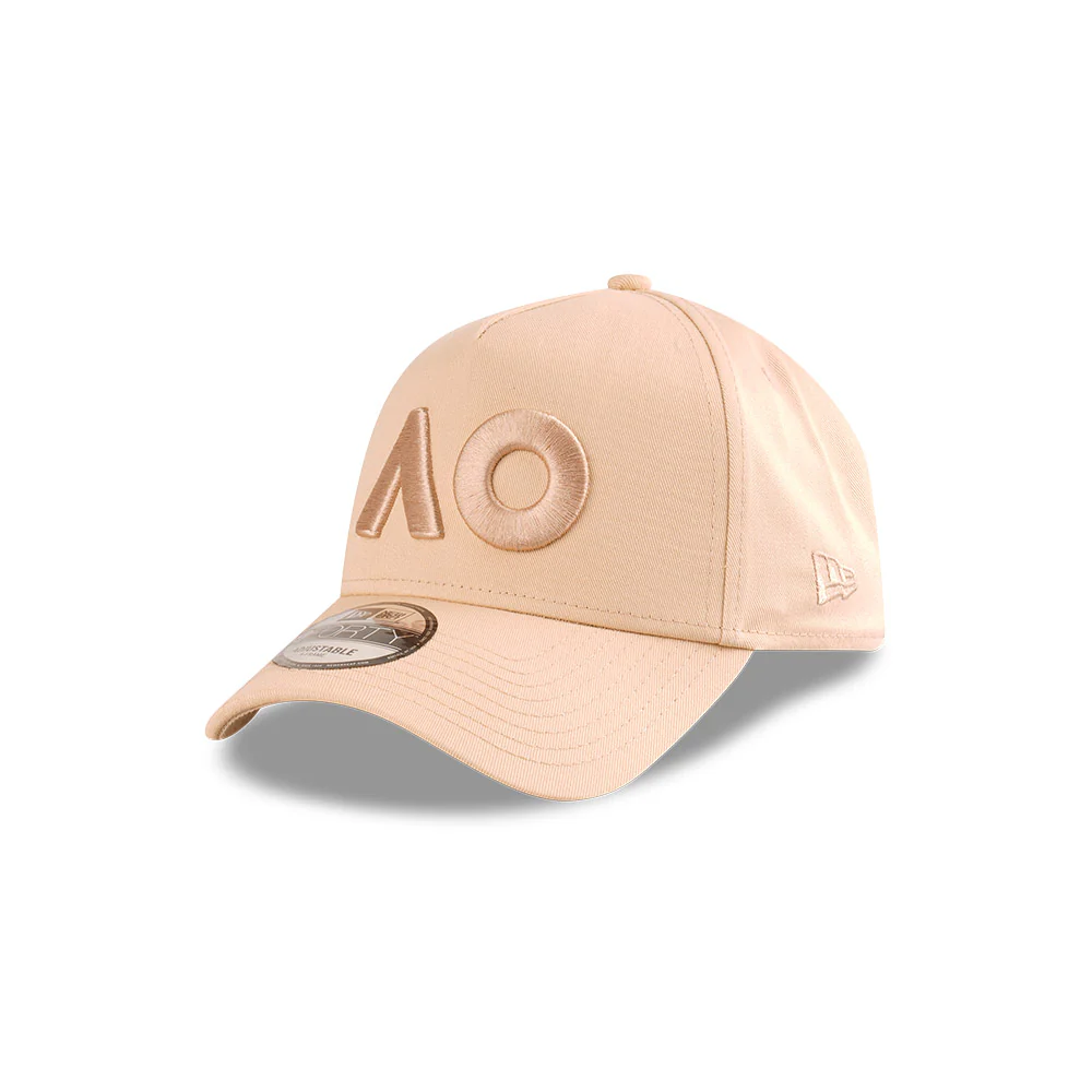 Introducing the AO 9FORTY A-Frame cap by New Era. This cap combines style and sport with its standout features as part of the exclusive AO collection. Its beige design combined with the same tone embroidered AO logo will add a touch of tennis flair to any outfit.